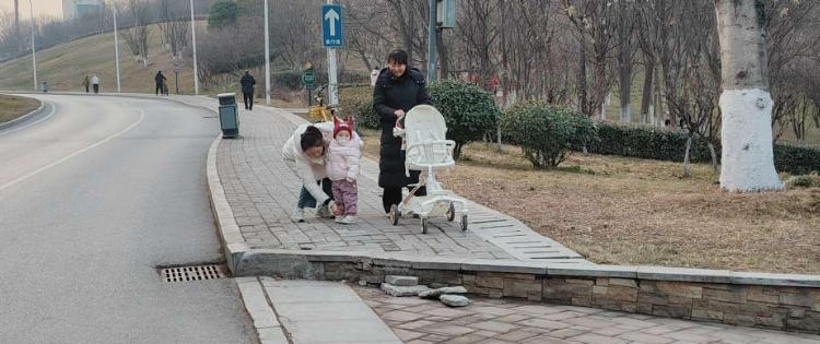 雁鸣湖公园南边的景区道路尴尬的台阶 无奈幼儿车